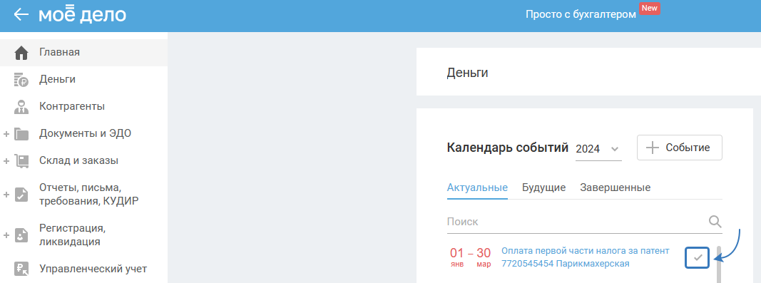 Если автоматическое создание операции по оплате патента не требуется (например, потому что первую часть стоимости патента вы уже оплатили), соответствующее событие в Календаре событий нужно пометить как завершённое. Для этого нажмите на налочку напротив события: