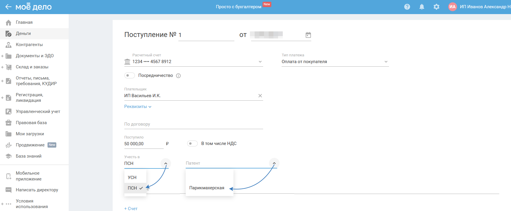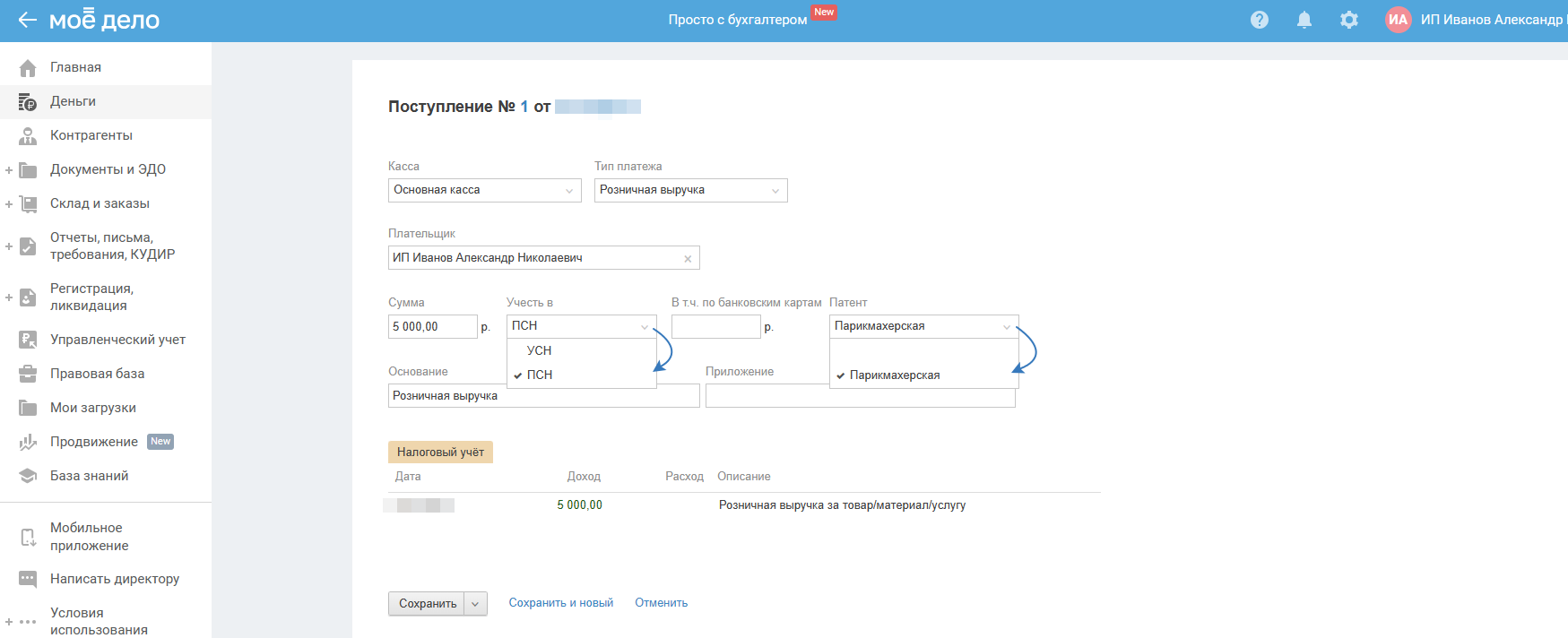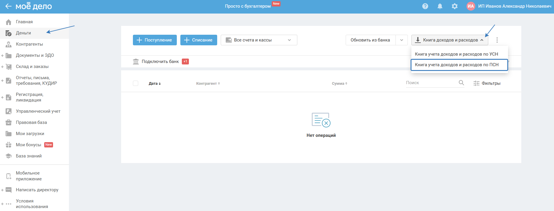 Как отразить операции в разделе Деньги с ПСН