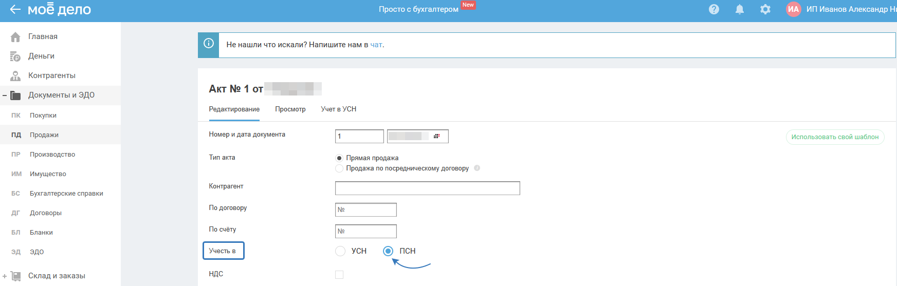 Что касается расходов, чтобы суммы учлись правильно, то режим ПСН нужно выбрать в документе (акте, накладной, УПД, ОРП), например: