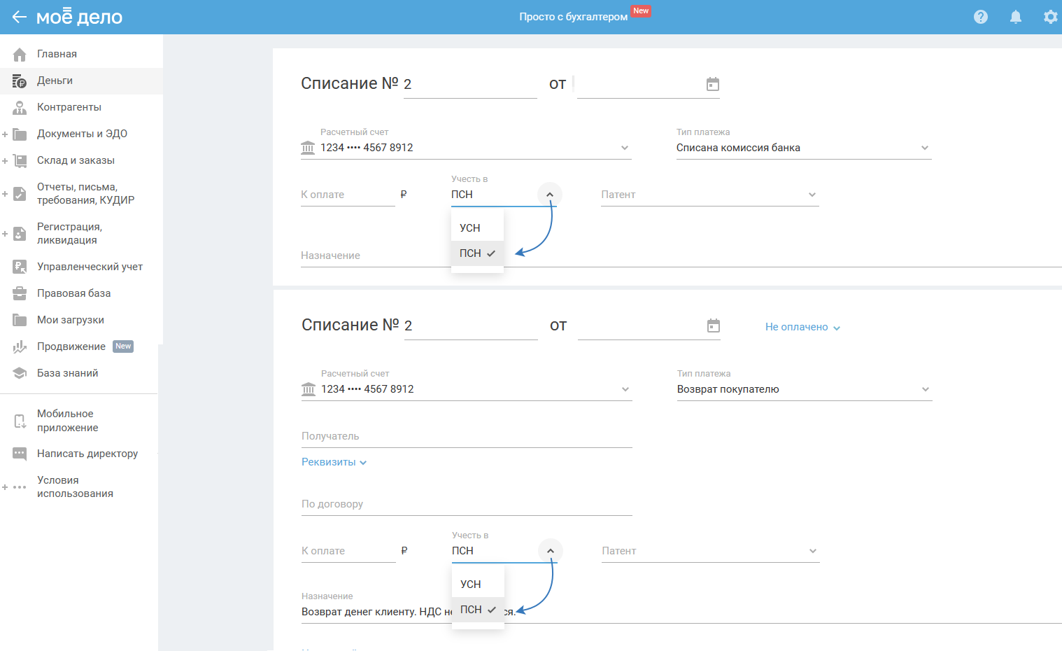 В операциях «Возврат покупателю» и «Списана комиссия банка» появится возможность отнести суммы к ПСН: