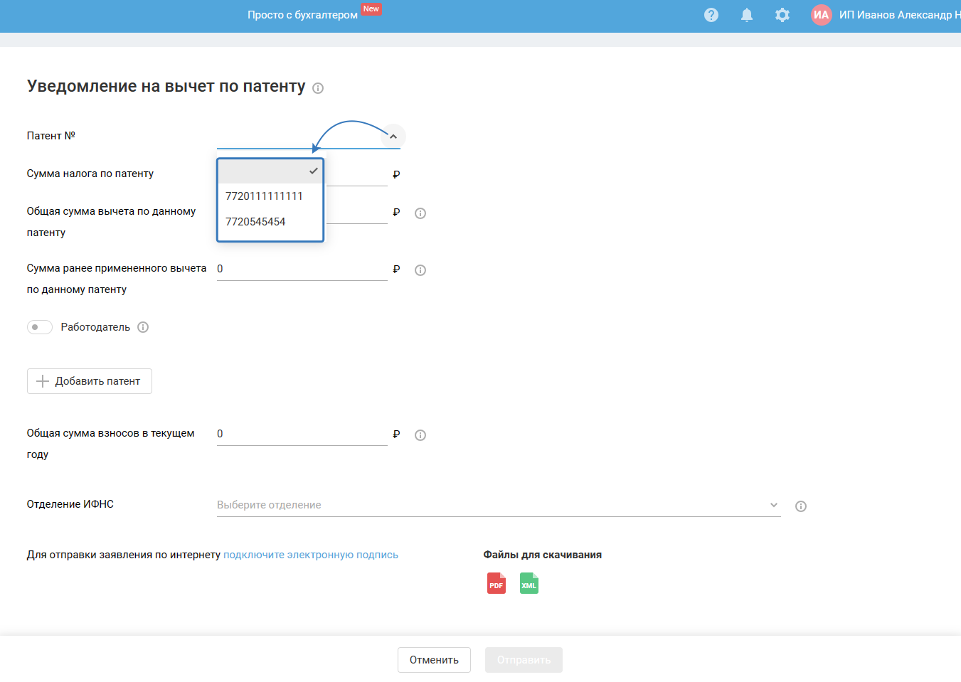 В уведомлении необходимо указать все патенты, для которых в течение года был применён вычет. Выберите из выпадающего списка нужный: