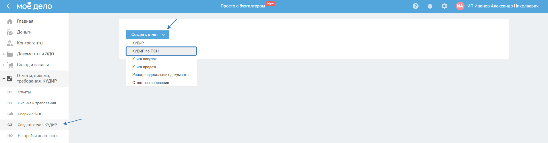 1. В разделе «Отчёты, письма, требования, КУДИР — Создать отчёт, КУДИР»: