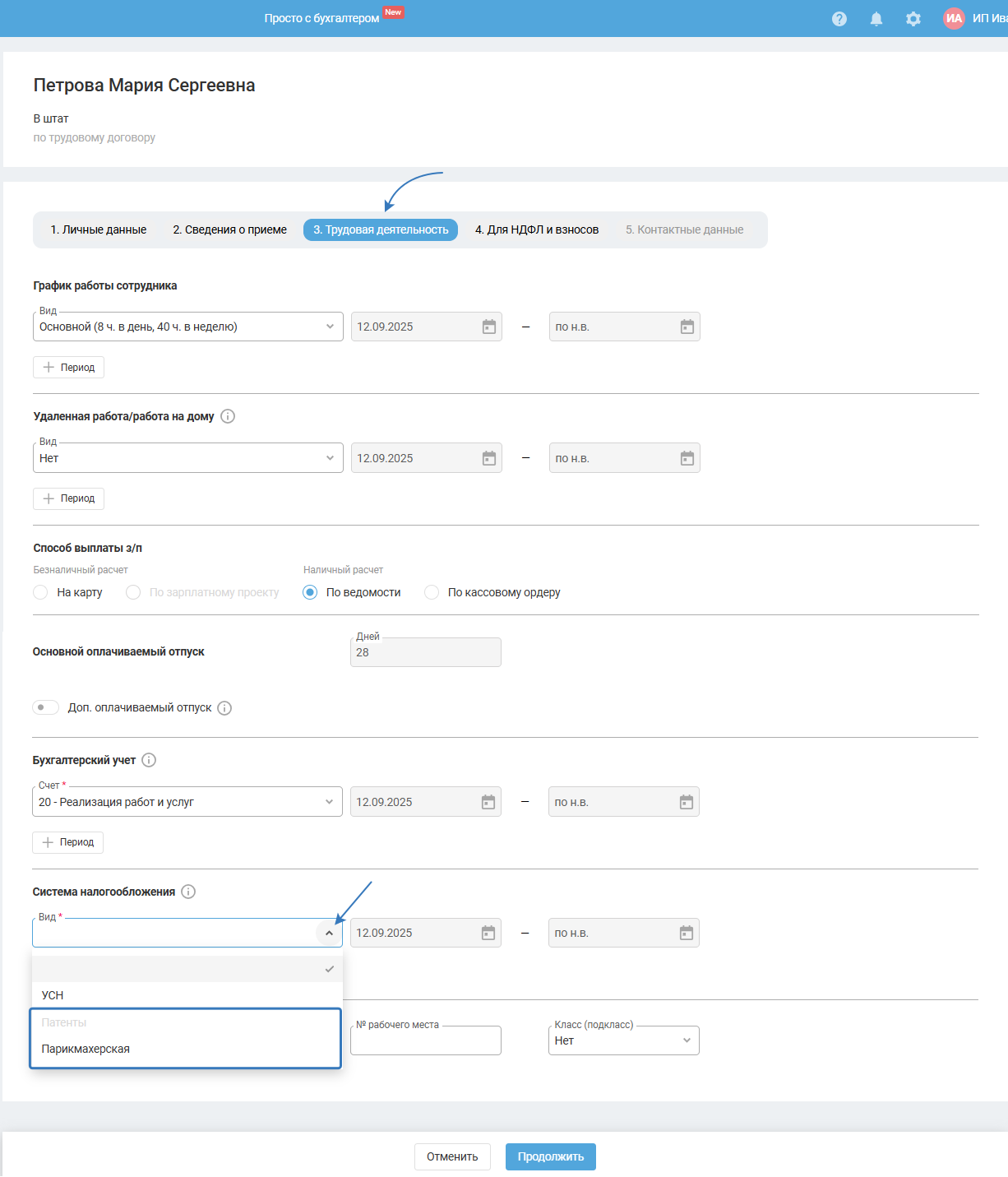 Далее в карточке сотрудника на шаге 3. Трудовая деятельность укажите систему налогобложения из выпадающего списка: