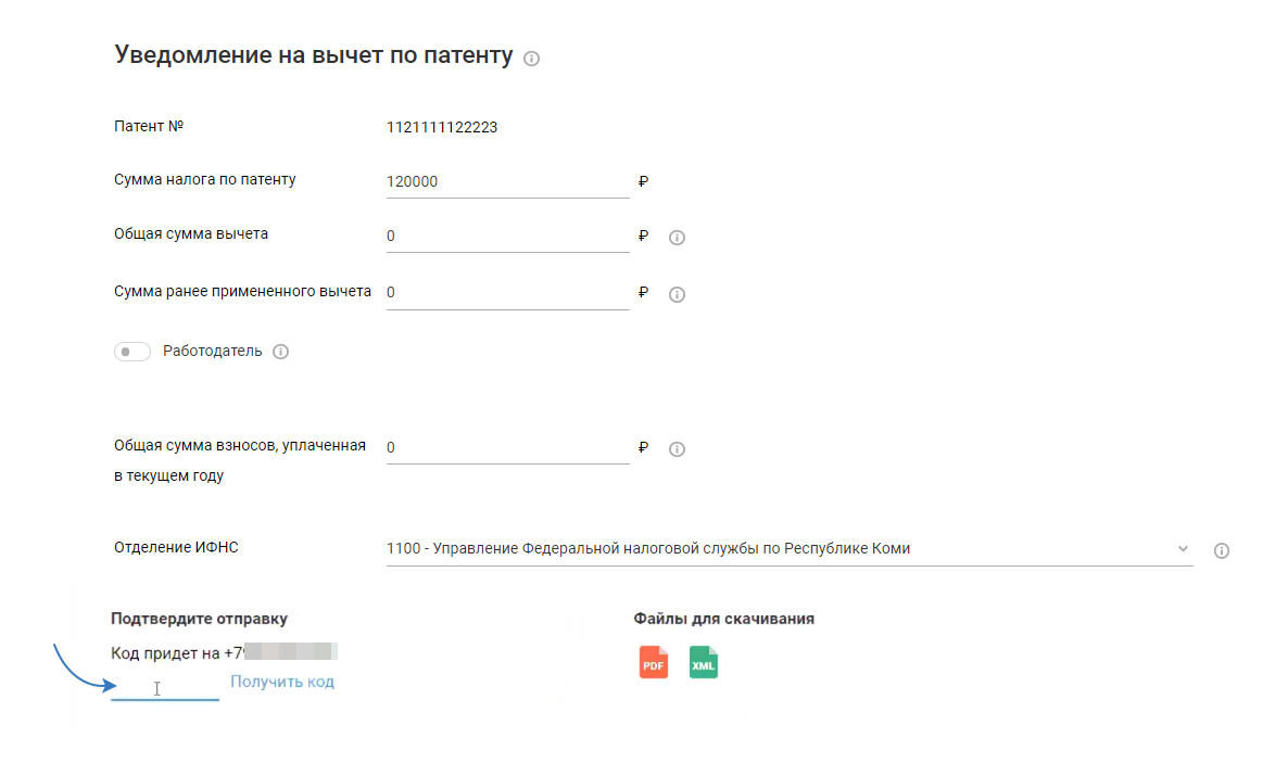 При электронной отправке уведомления, введите код из смс и нажмите кнопку «Отправить».