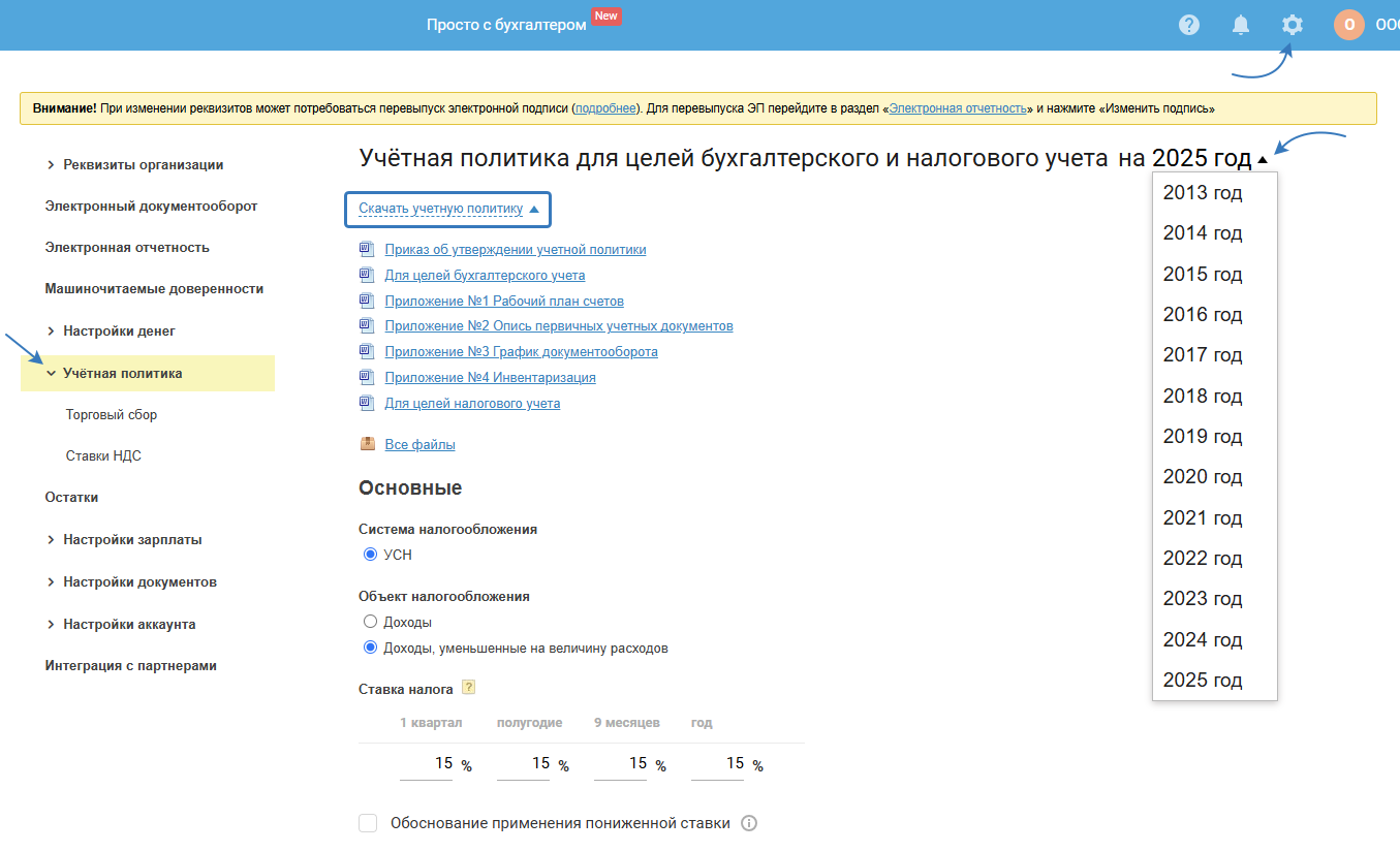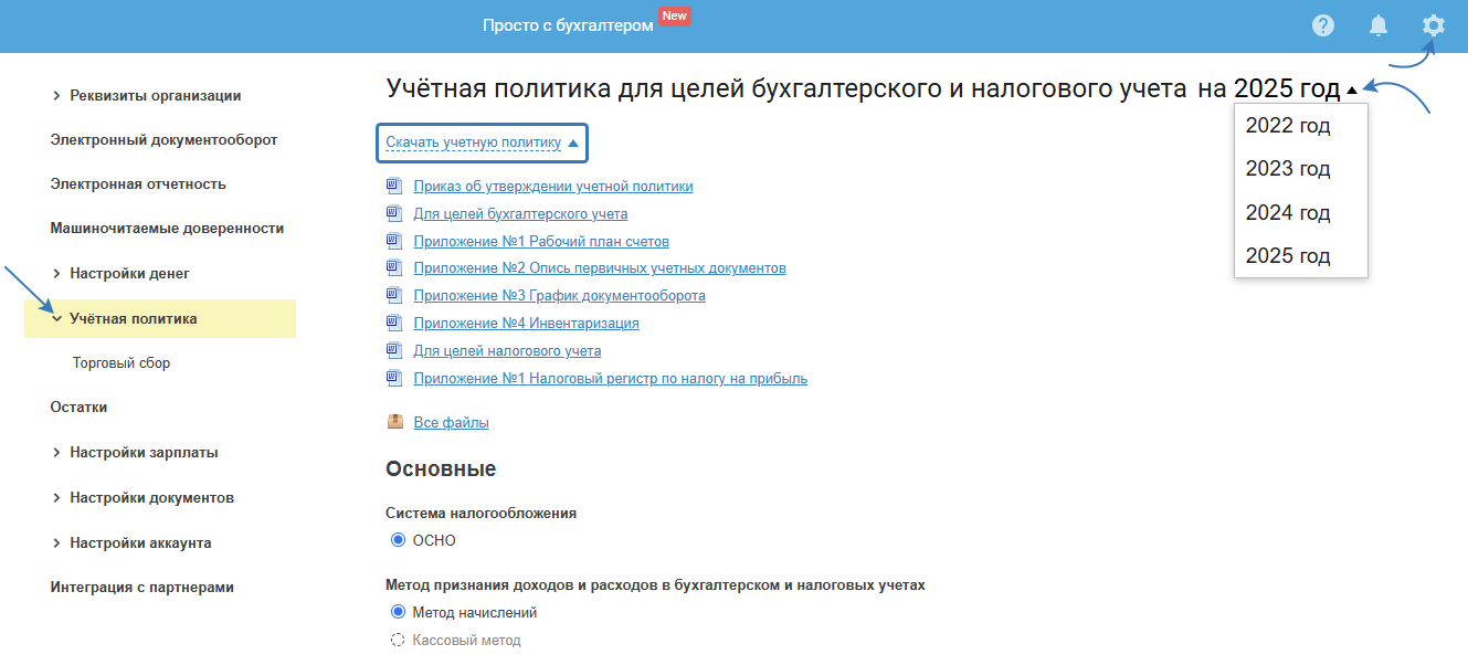 - Укажите год и нажмите на ссылку «Скачать учётную политику», которая позволяет скачать печатную форму учётной политики для организации. Текст в файле соответствует учёту в сервисе.