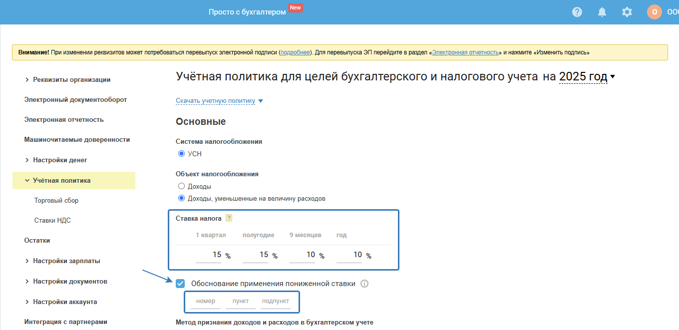 Если вы применяли пониженную ставку весь год, то необходимо установить её в каждом квартале. Если пониженная ставка применялась только в определённом квартале, то только в данном квартале её и нужно установить. Далее ставка автоматически окажется в квартальных и годовых мастерах УСН.