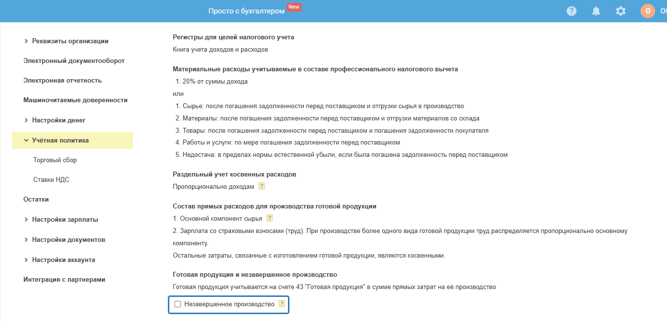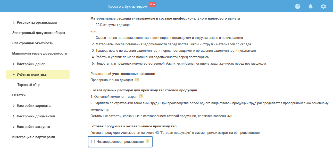 Если производственный цикл выходит за рамки месяца, то в пункте «Готовая продукция и незавершенное производство» поставьте галку напротив «Незавершённое производство»: