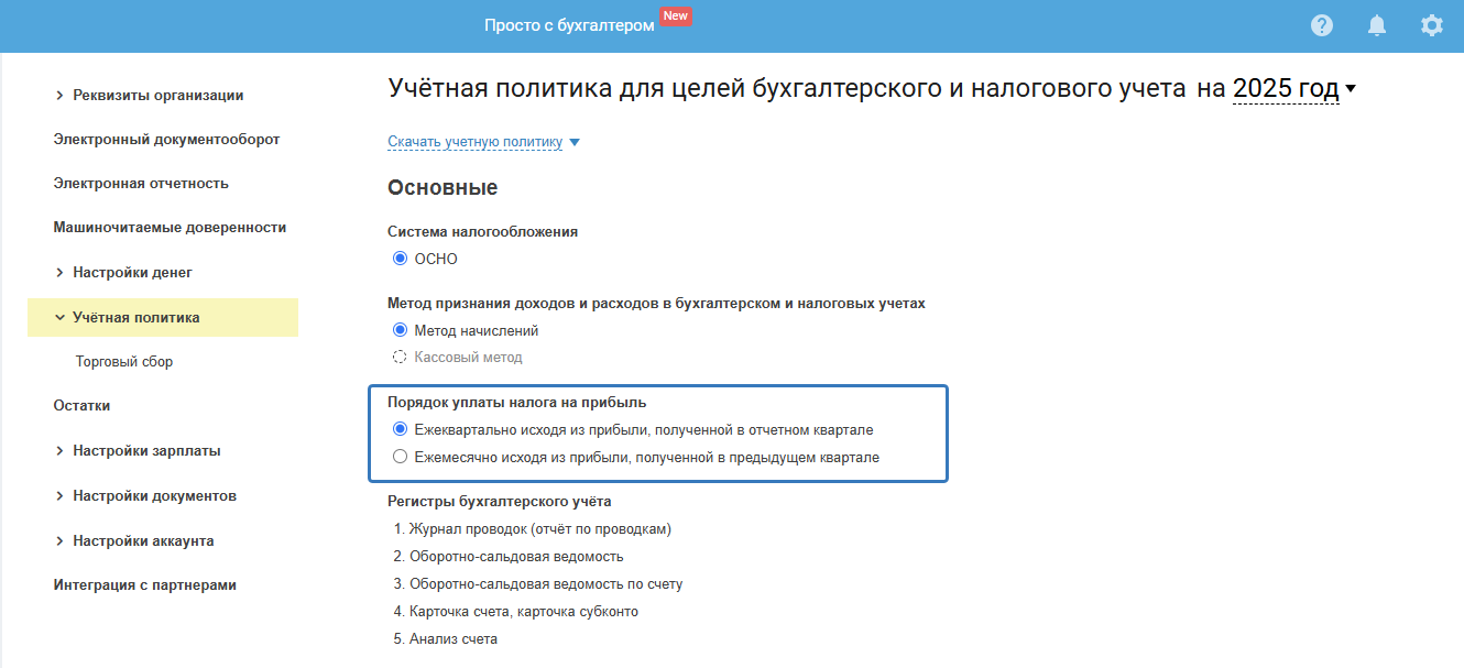 В блоке «Порядок уплаты налога на прибыль» (актуально для ОСНО) выберите нужный, а именно: