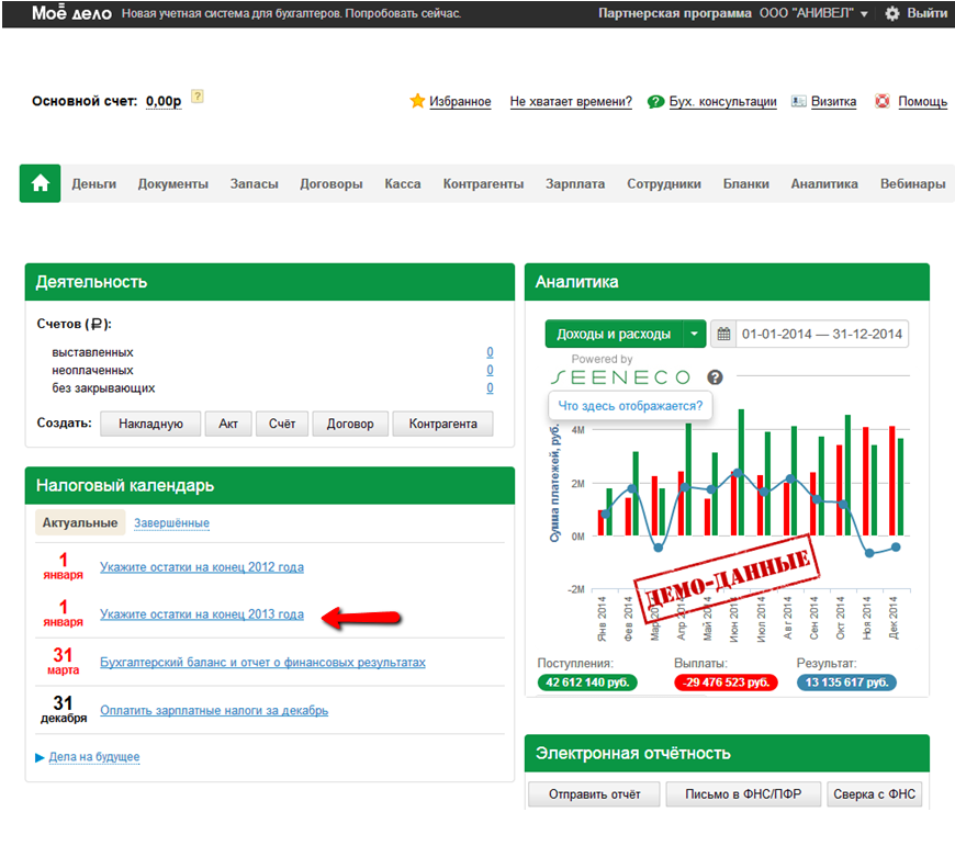 В "Налоговом календаре" нажмите на действие "Укажите остатки на конец ____ года". После Вы попадаете в мастер, который состоит их нескольких шагов (чтобы ознакомиться с инструкцией по шагу, нажмите на активную ссылку этого шага):