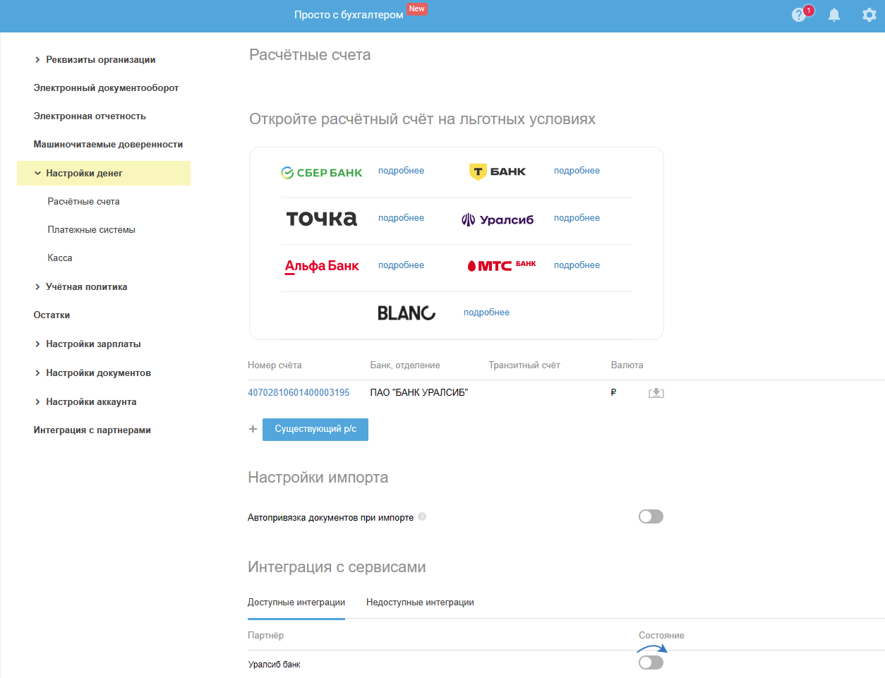 В разделе «Настройки денег» и в подразделе «Доступные интеграции» найдите «Уралсиб банк».