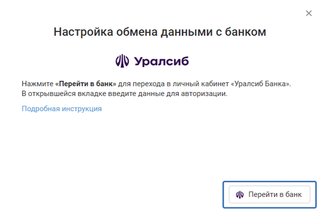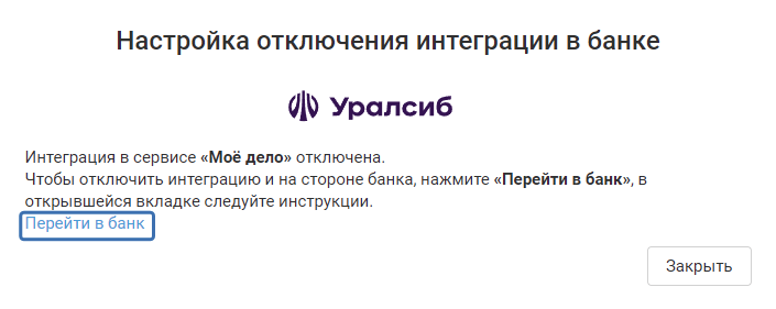 Для отключения интеграции на стороне банка в появившемся окне нажмите на кнопку «Перейти в банк»:
