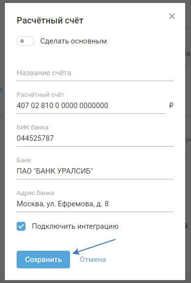 1. Перед включением интеграции нужно добавить в личный кабинет «Моё дело» расчётный счёт, открытый в банке. Для этого: