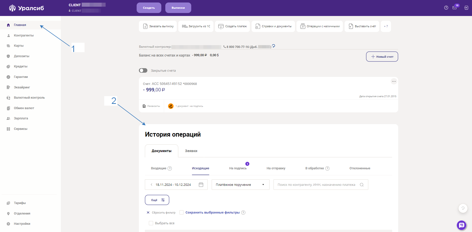 Отправленные из сервиса «Моё дело» платежи находятся на главной странице в разделе «История операций» на вкладке «Документы». Данные платёжные поручения имеют статус «На подпись».