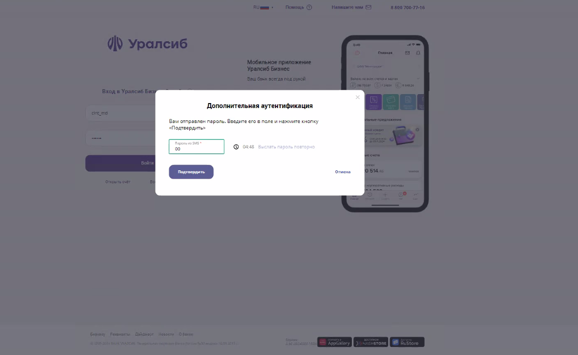 Введите СМС-пароль для дополнительной аутентификации и нажмите кнопку «Подтвердить»: