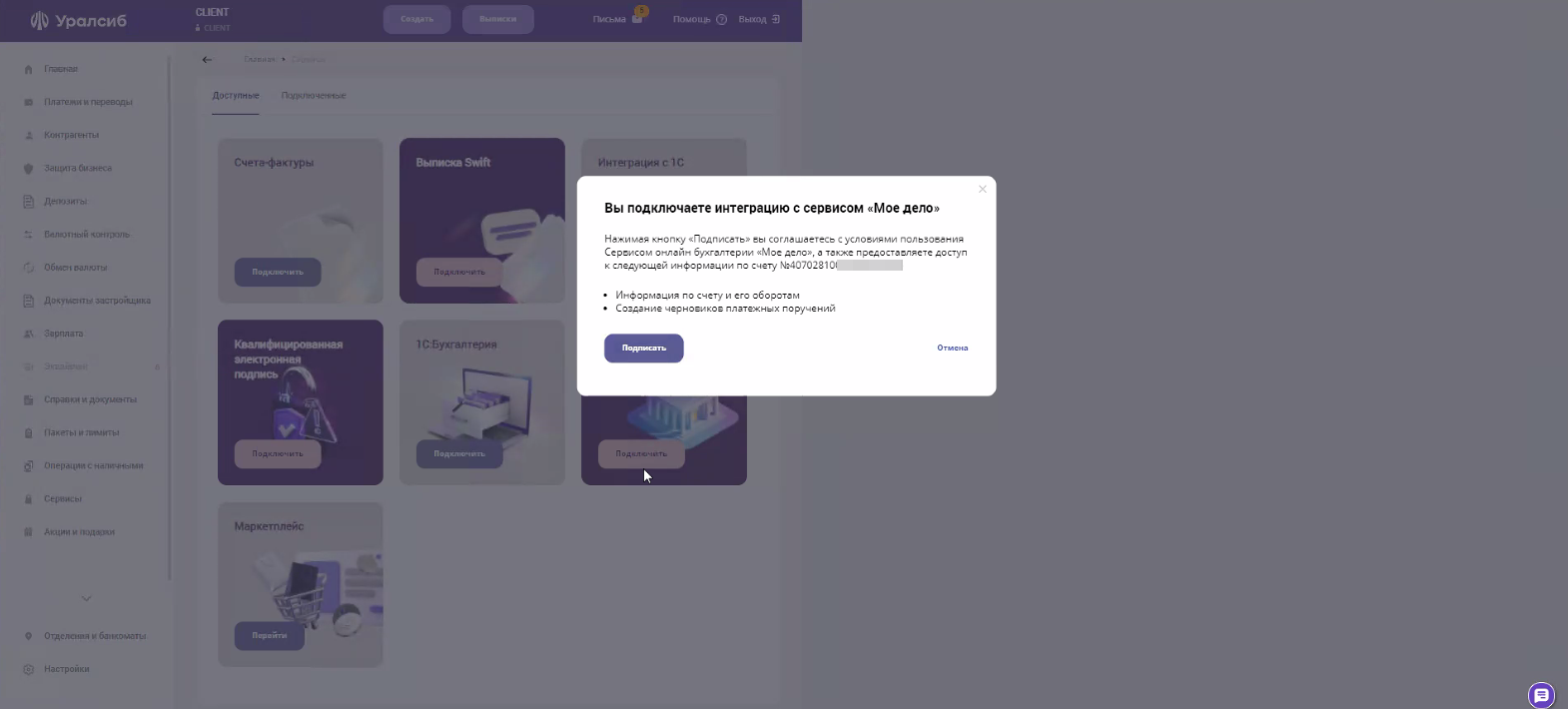 Для подтверждения подключения интеграции с сервисом «Моё дело» нажмите на кнопку «Подписать»: