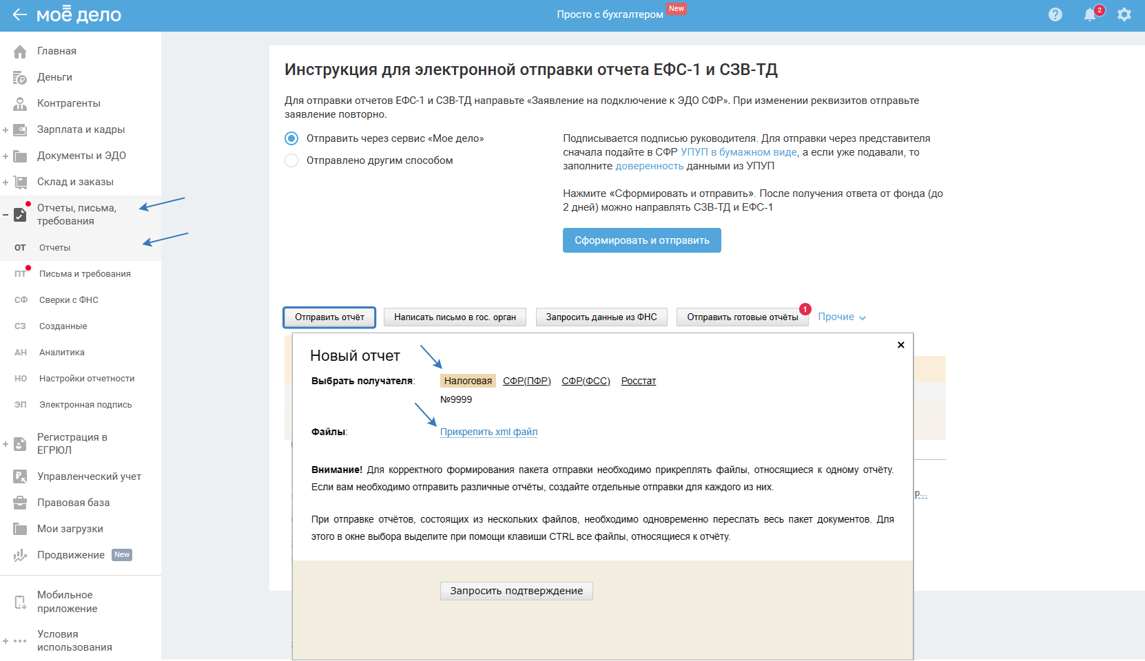 Либо в разделе «Отчёты, письма, требования — Отчёты» нажмите на кнопку «Отправить отчёт»: