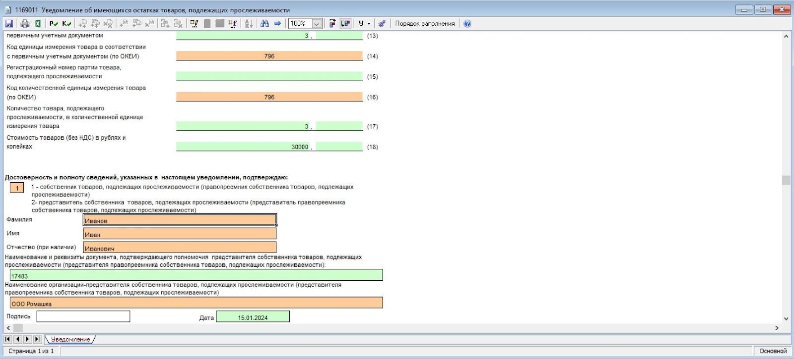 - Наименование — Уведомление об имеющихся остатках, подлежащих прослеживаемости.