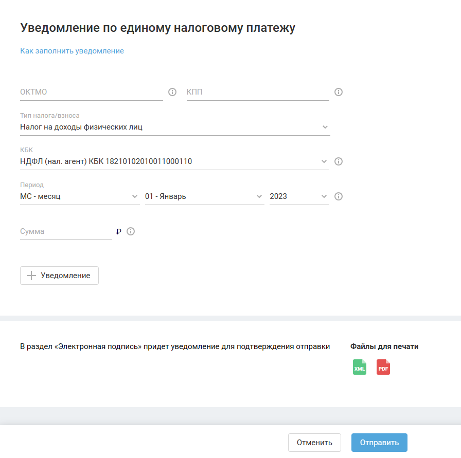 В поле «Тип налога/взноса» выберите вид налога, по которому вы формируете уведомление, КБК будет заполнено автоматически.