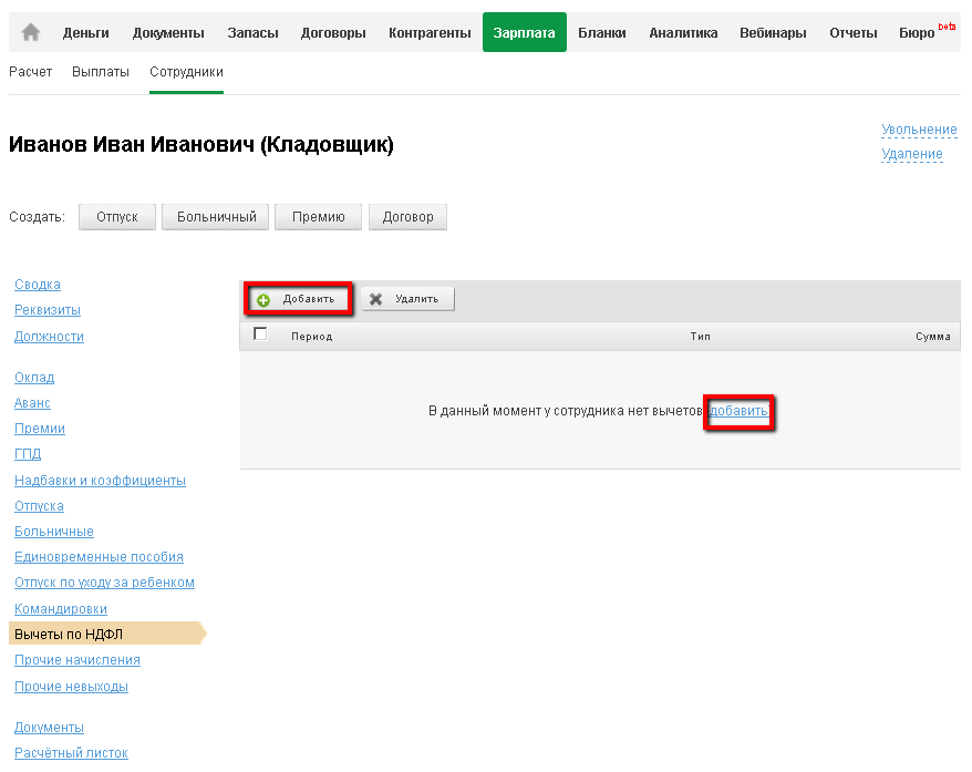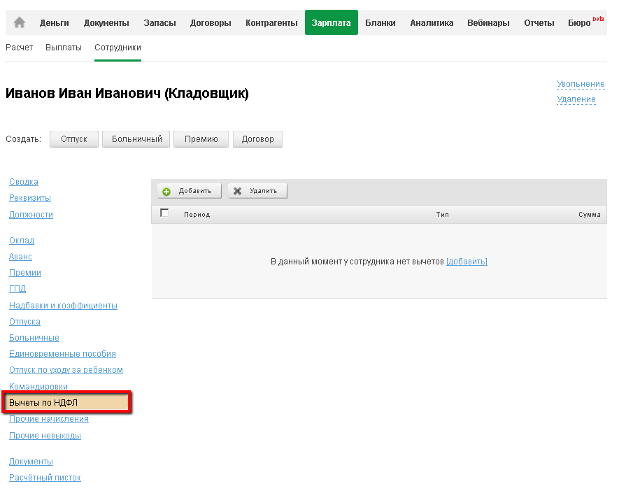 Этот раздел предназначен для добавления и редактирования информации о вычетах по НДФЛ и периодах времени в течение которого они должны предоставляться работнику. Для начала работы нужно перейти в пункт бокового меню - "вычеты по НДФЛ".