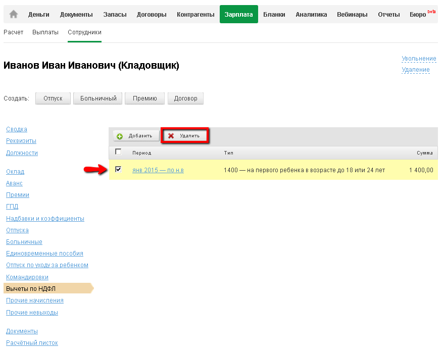 Чтобы удалить информацию о вычете по НДФЛ (например, если она была добавлена по ошибке), напротив нужной строки нужно поставить галочку и нажать на кнопку "удалить".