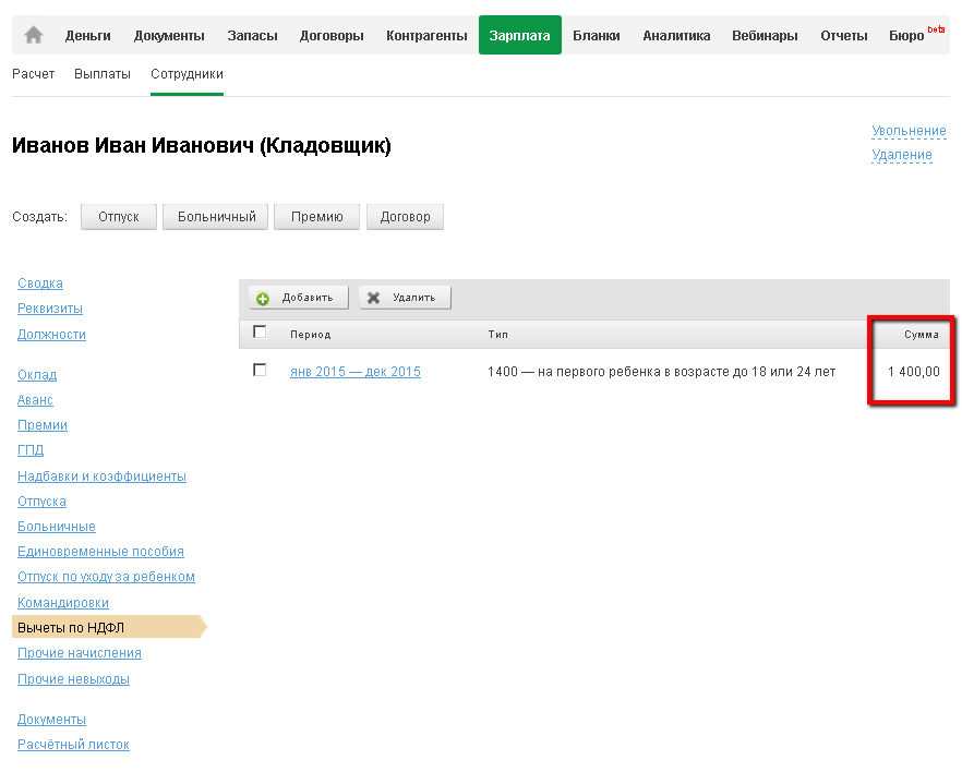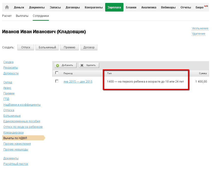 - вид вычета - выберите из выпадающего списка вид вычета (на ребенка, на сотрудника, имущественный, социальный).