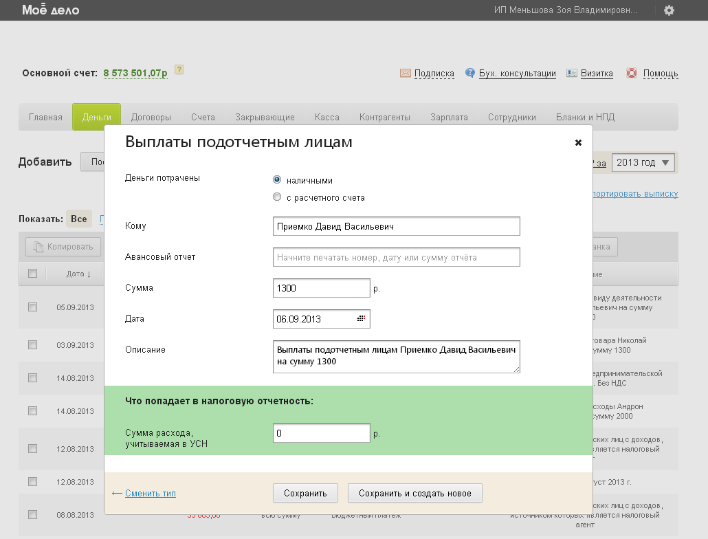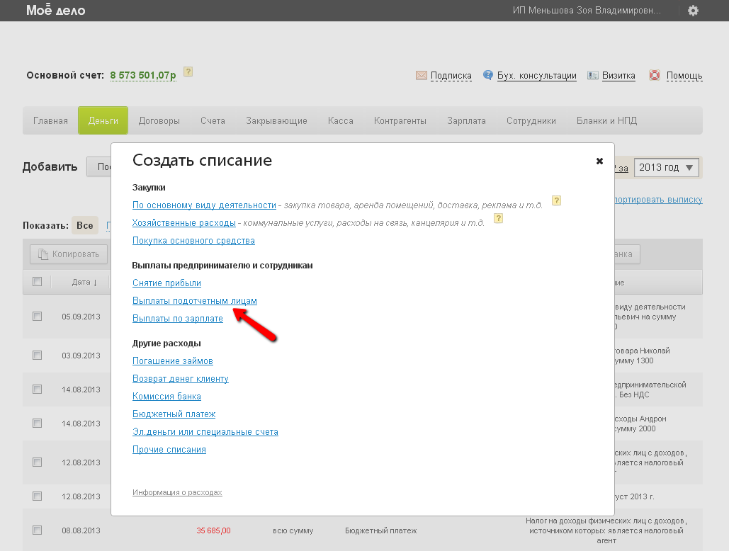 Данный тип списания используется работодателями в случае, если сотруднику выдаются денежные средства под отчет. Чтобы сотрудник потратил их для целей организации/ИП.
