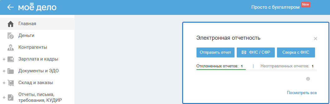 На Главной странице в виджете «Электронная отчётность» отражаются все подготовленные для отправки через интернет отчёты и документы, а также отправленные документы и их статусы. Аналогичная информация отображается в разделе «Отчёты, письма, требования — Отчёты».