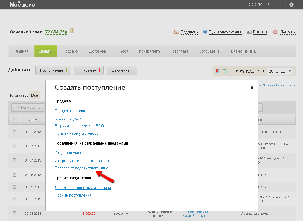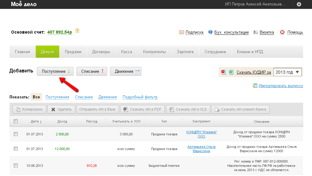 В разделе «Деньги» в строке «Добавить» нажмите кнопку «Поступление».