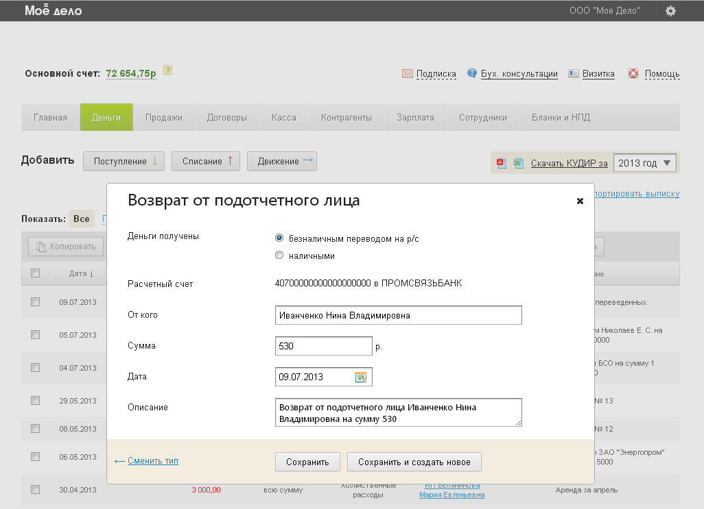 В поле «Описание» автоматически подставляется стандартный текст по описанию операции: «Возврат от подотчетного лица ФИО сотрудника на сумму ______». Но вы можете отредактировать данный текст на ваше усмотрение.
