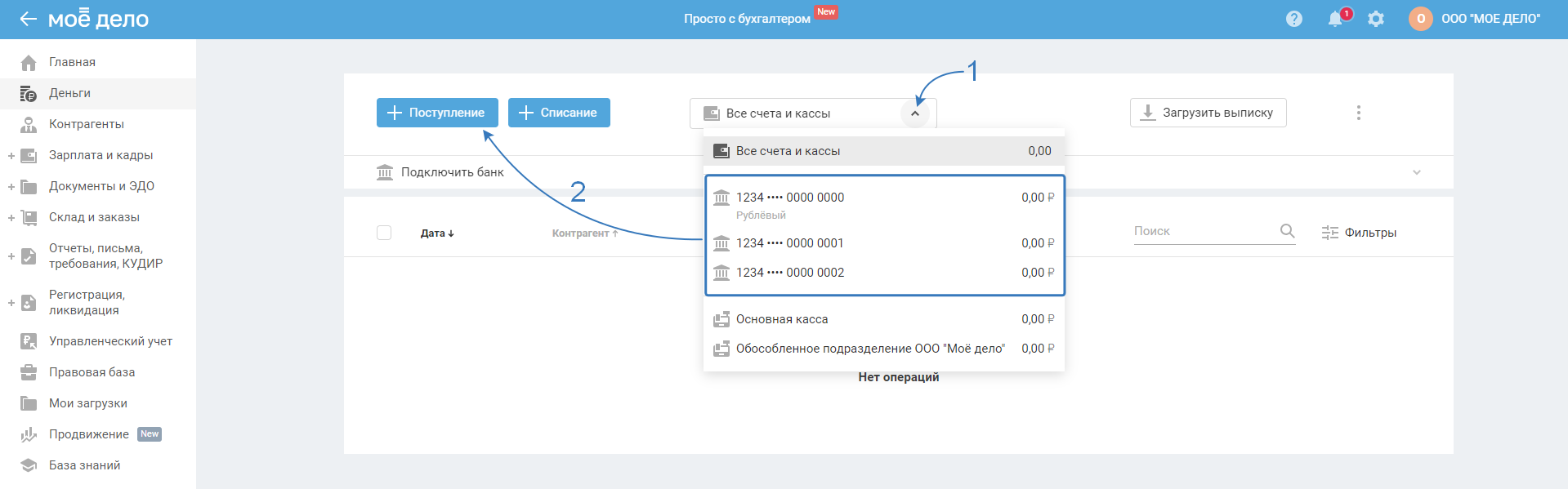 В разделе «Деньги» выберите р/сч и нажмите на кнопку «Поступление»: