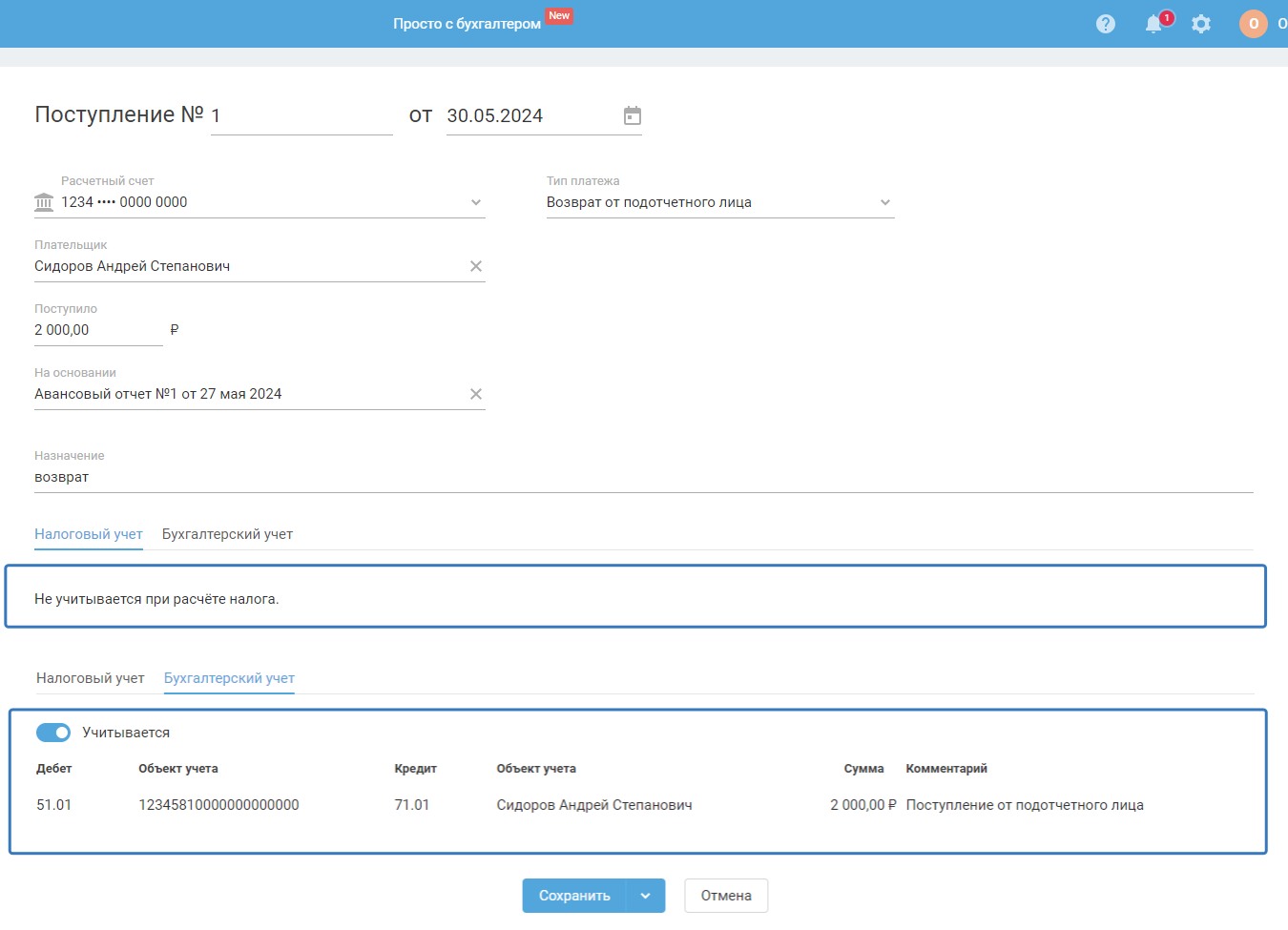 - входящее платёжное поручение с типом «Возврат от подотчётного лица» (при безналичном поступлении денежных средств);