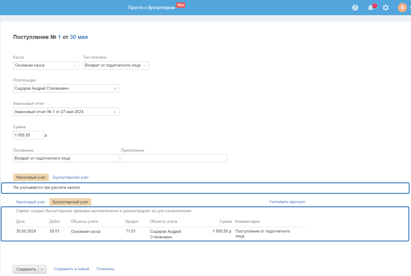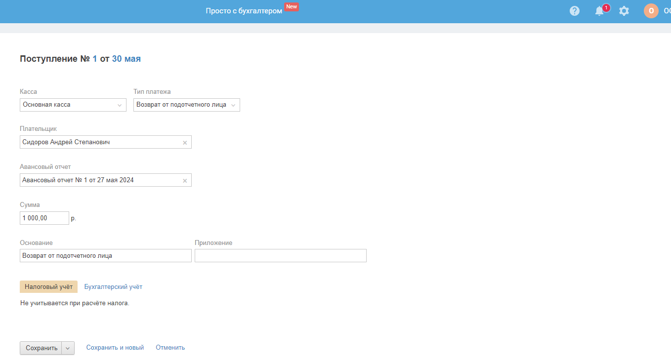 После заполнения всех полей на странице поступления с типом «Возврат от подотчётного лица» его необходимо сохранить. Все приходные кассовые ордера должны быть распечатаны, корешок ПКО необходимо отдать вносителю средств.