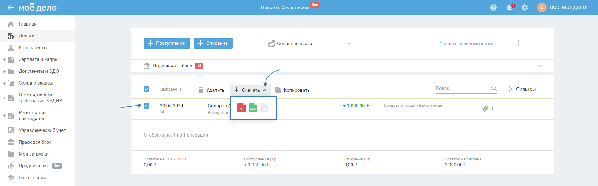 - приходный кассовый ордер с типом «Возврат от подотчётного лица» (при поступлении наличных денежных средств).